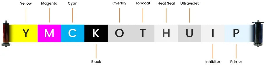 Each ribbon panel code represents a specific combination of colors and overlays used in ID card printing. The letters indicate the sequence in which colors, protective layers, or specialty features are applied to the card during the printing process.